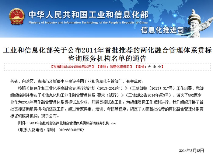 按照《信息化和工業(yè)化深度融合專項(xiàng)行動(dòng)計(jì)劃(2013-2018年)》(工信部信〔2013〕317號(hào))工作部署,工信部組織編制并發(fā)布了《信息化和工業(yè)化融合管理體系要求(試行)》(工信部公告2014年第3號(hào)),遴選了502家企業(yè)作為2014年兩化融合管理體系貫標(biāo)試點(diǎn)企業(yè),開展貫標(biāo)試點(diǎn)工作。為確保貫標(biāo)工作順利進(jìn)行,工信部信息化司組織開展了首批貫標(biāo)咨詢服務(wù)機(jī)構(gòu)的遴選工作。經(jīng)過專家評審、培訓(xùn)、考核等程序,確定了80家首批推薦的兩化融合管理體系貫標(biāo)咨詢服務(wù)機(jī)構(gòu),中國機(jī)械工業(yè)企業(yè)管理協(xié)會(huì)通過層層考核評審,成為80家獲得貫標(biāo)咨詢服務(wù)機(jī)構(gòu)資質(zhì)中唯一一家協(xié)會(huì)組織。