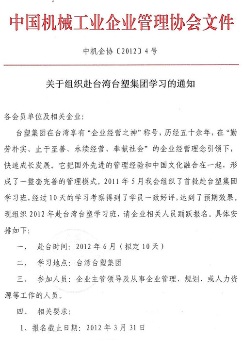 關于組織赴臺灣臺塑集團學習的通知