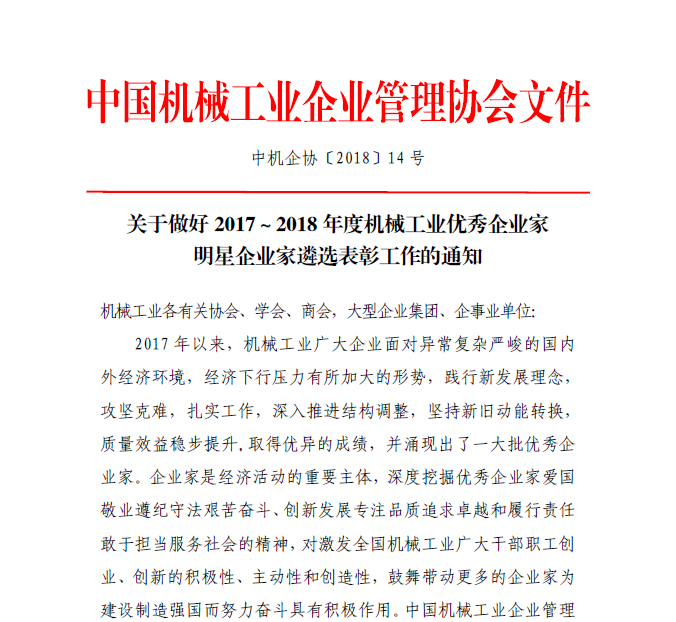 關于做好2017~2018年度機械工業(yè)優(yōu)秀企業(yè)家、明星企業(yè)家遴選表彰工作的通知