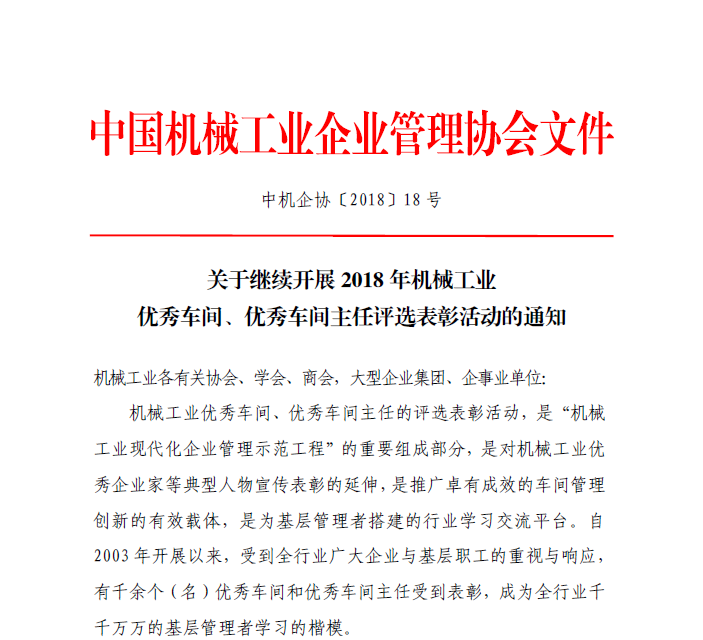 (五)對于車間管理經驗具有創新性、實踐性、效益性的車間,我們會將其管理經驗的材料推薦給中國機械行業企業管理現代化創新成果審定委員會,參加當年的成果審定。