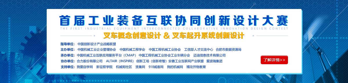 日前,由“中國創新設計產業戰略聯盟”指導,中國機械工業企業管理協會、中國機械工程學會、中國工程機械工業協會、工業和信息化部人才交流中心、合肥市數據資源局主辦,中國機械工業互聯應用服務平臺(CMAP),中國工程機械協會工業車輛分會、邁迪信息技術公司承辦,合力股份有限公司、澳汰爾工程軟件(上海)有限公司、深圳創新奇智科技有限公司、安徽工業互聯網產業聯盟、愛波瑞集團協辦,機械狗社區、精攻開物教育、我的機械網、我要自學網、賢集網、新征程學院、918威客網支持的“全國首屆工業裝備互聯協同創新設計大賽(叉車專題賽)”報名通道關閉。