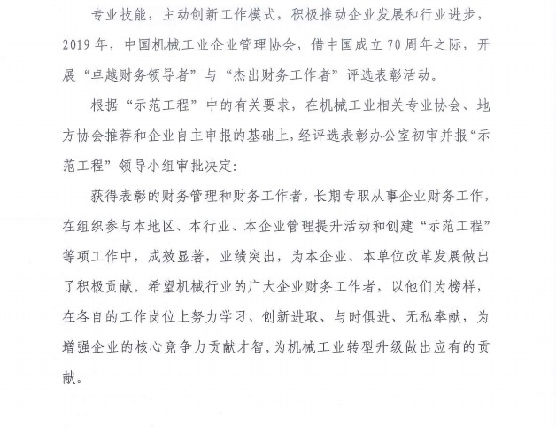 關(guān)于表彰2019年度機(jī)械工業(yè)卓越財(cái)務(wù)領(lǐng)導(dǎo)者及杰出財(cái)務(wù)工作者的決定